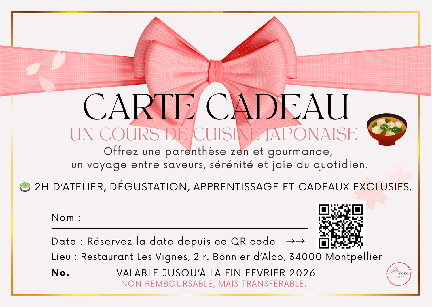Pour toute question, contactez à l’adresse suivante : info.ateliercuisineyoko@gmail.com
